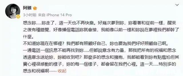 大S的好友阿雅,也在六日这一天发文悼念大S!