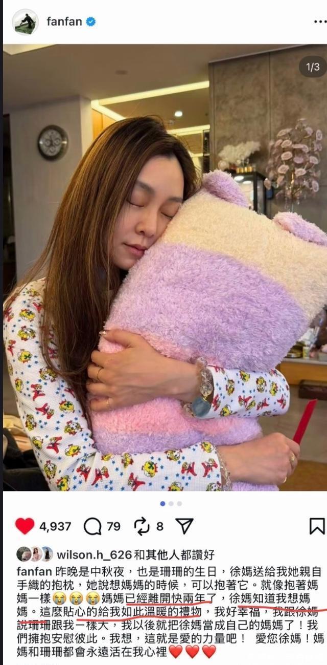 十月六日这天,又是中秋节,又是女儿的生日!对于S妈来说,一定很难熬!范玮琪发文说,S妈送给范玮琪手织的抱枕!范玮琪说,她和大S一样大,以后就把S妈当自己的妈妈了,而范玮琪又是大S的好友,他们又都住在湾湾,也方便范玮琪去照顾S妈!